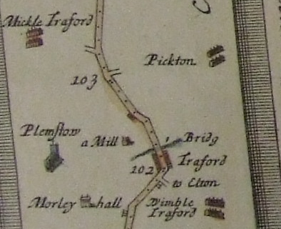 William Troutbeck took over the Mill in 1416 and remained in possession of the property until 1510 when the inheritance passed to the Talbots who later became the Earls of Shrewsbury. The Earls of Shrewsbury continued to hold an interest as absentee landlords until 1917. Various archives across the country hold estate papers relating to the Talbots’ land, but unfortunately no medieval deeds survive for the Mill. However, further sources of historic evidence indicate the Mill was in use throughout the Tudor period and beyond. The Mill is recorded on Ogilby’s 1675 road map and William Smith’s Map of Cheshire dated 1680. Sadly these small scale pictorial maps give little detail other than the existence of a mill west of Trafford Bridge.