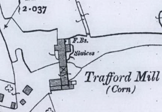 Although the Mill produced animal feed, the small wheel at the north end continued to be used for fine flour production until demand ceased during WWI. There appears to be little change on site over the past one hundred years, as indicated by the 1910 OS plan. In December 1917, the Chester Estates of the Earl of Shrewsbury, were auctioned. Trafford Mill was advertised as Lot 67 and described as follows: